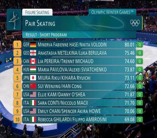 2月16日,米兰冬奥会进行了花样滑冰双人滑短节目比赛。中国组合韩聪/隋文静以72.66分排名第六进入自由滑。德国组合黑泽/沃罗登以80.01分在短节目排名第一。赛后,韩聪和隋文静提到了,这是最后一套短节目,同时自由滑应该是奥运生涯最后一舞,让许多花滑迷们感慨不已。